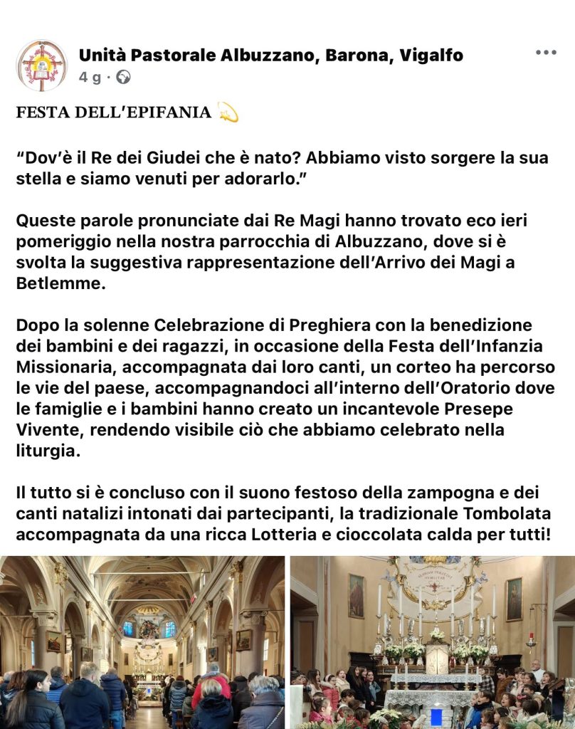 Eventi Albuzzano – FESTA DELL’EPIFANIA E PRESEPE VIVENTE – Messa della Notte di Natale nella Chiesa dell’Assunzione di Maria Vergine in Albuzzano – 16 dicembre 2025 Giornata parrocchiale dedicata alla famiglia – Giorno della sagra 2025 In costruzione